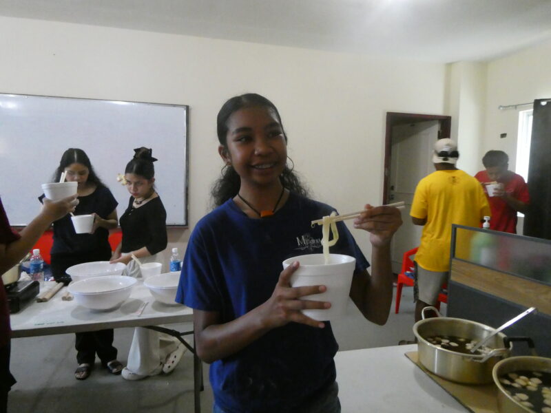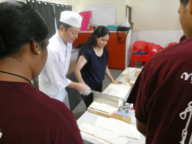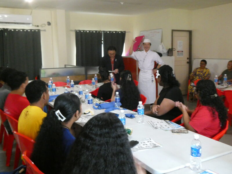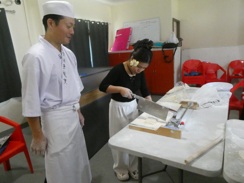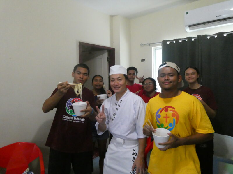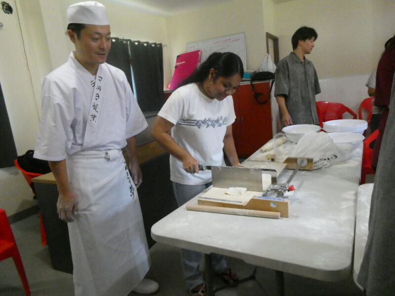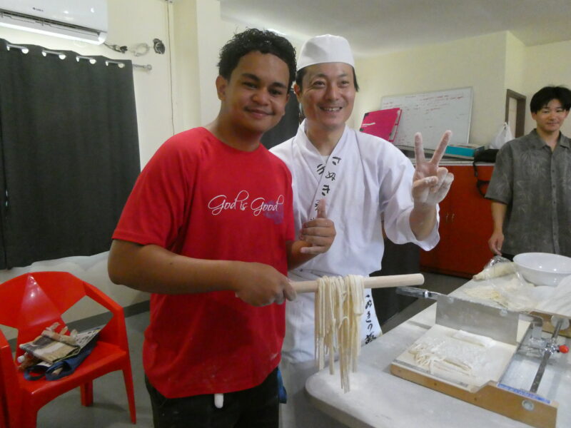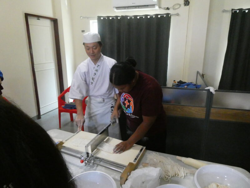 12月20日、ミゼンティ高校にてうどん体験会を行いました。ミゼンティ高校では前日まで学期末のテストが行われており、この日はクリスマス休暇の初日にあたります。サンティ・アサヌマ郵政長官がミゼンティ高校で授業を担当されていることから、ミゼンティ高校でのうどん体験会の企画が実現しました。