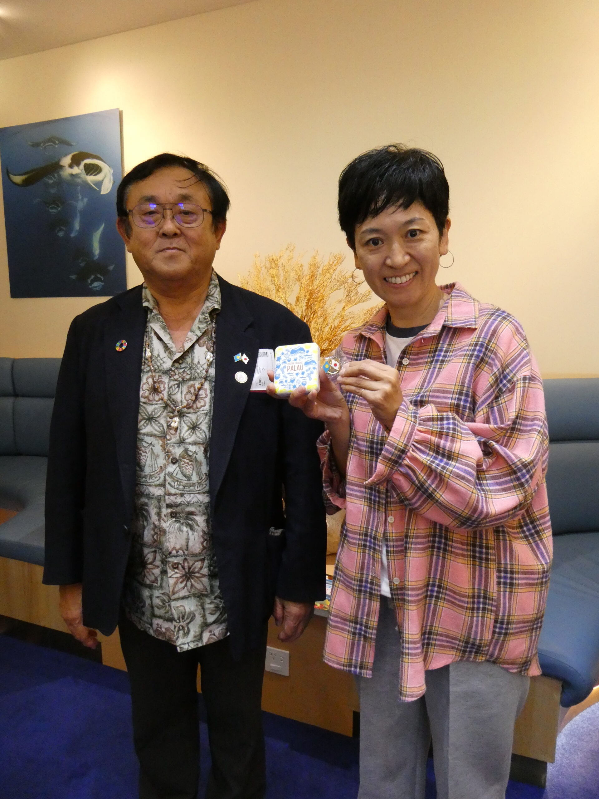 パラオ&日本のバッジと第一便の記念品であるモバイルバッテリーをプレゼントさせていただきました