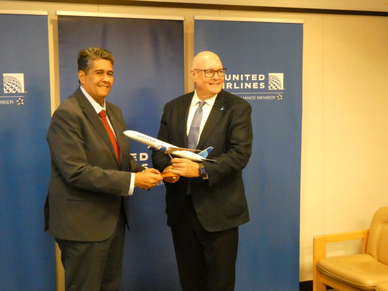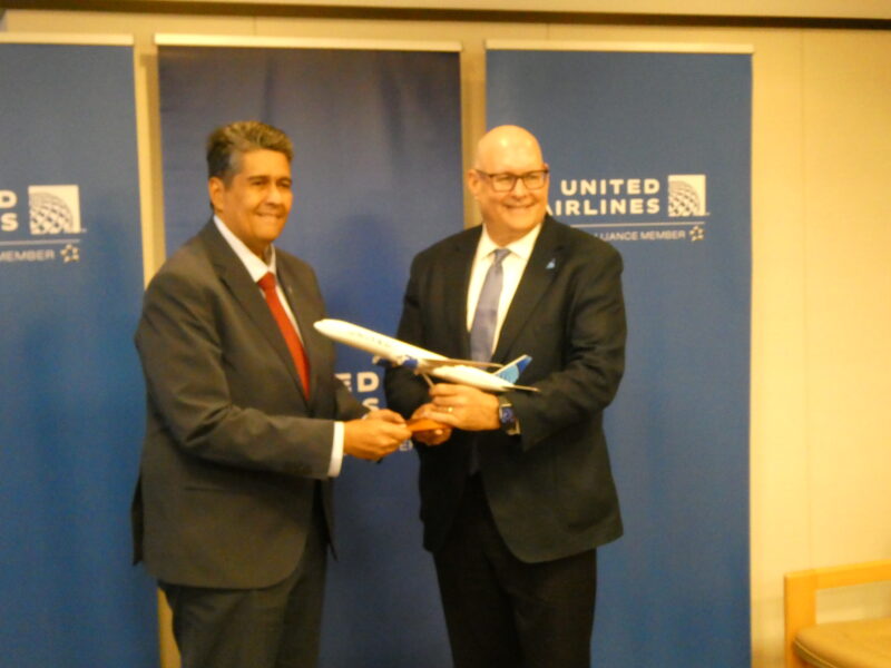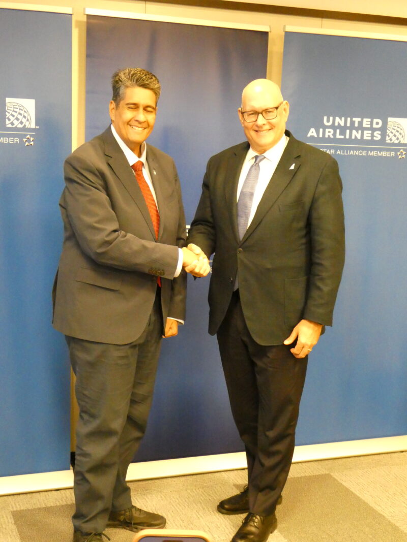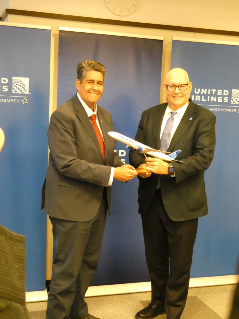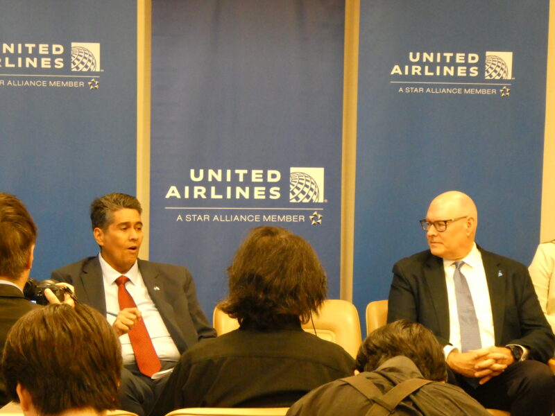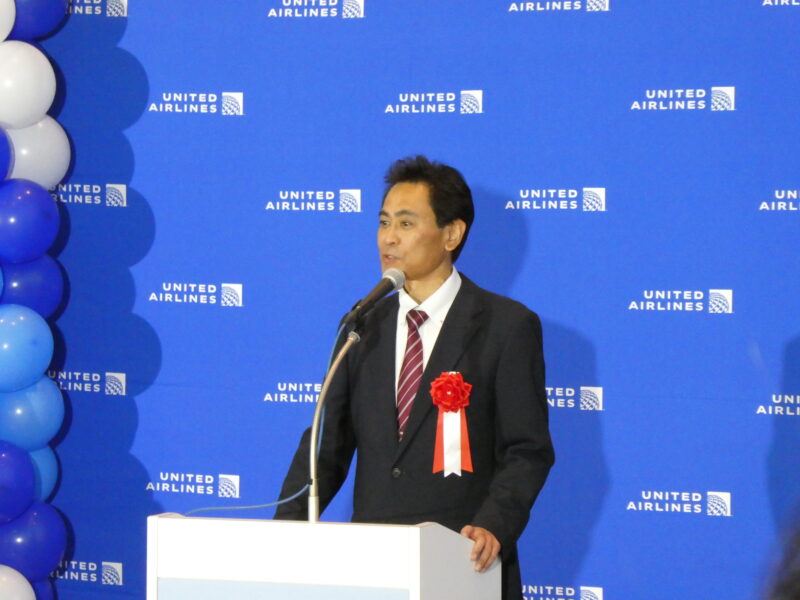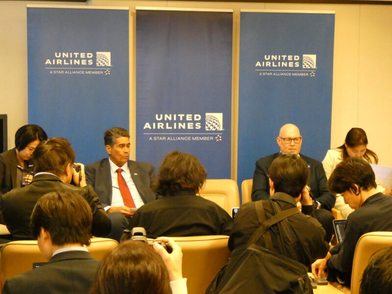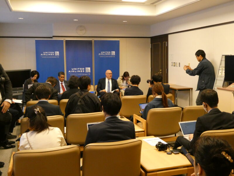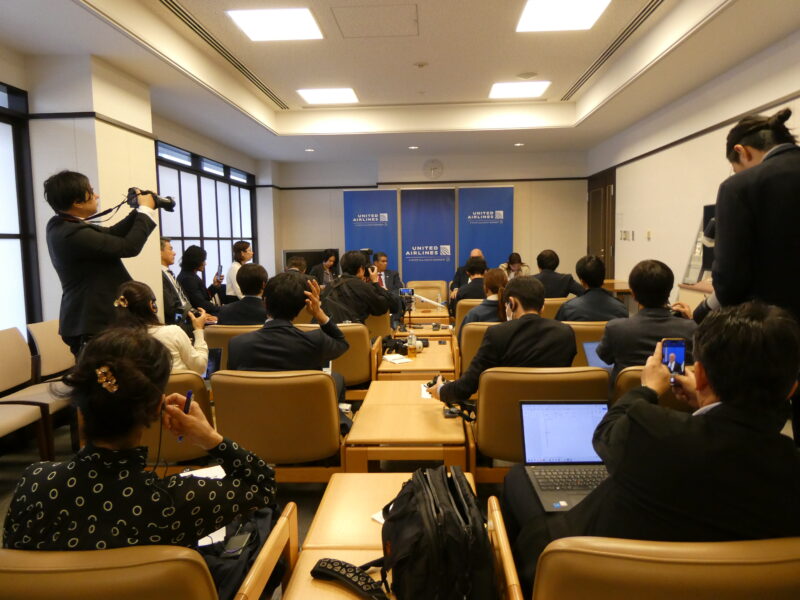 岩田名誉総領事は今回の直行便の就航についてユナイテッド航空主催のプレスカンファレンスにも同席いたしました。プレスカンファレンスではとユナイテッド航空のスティーブ・モリッシー副社長とウィップス大統領が挨拶をし、その後報道陣との質疑応答が行われました。